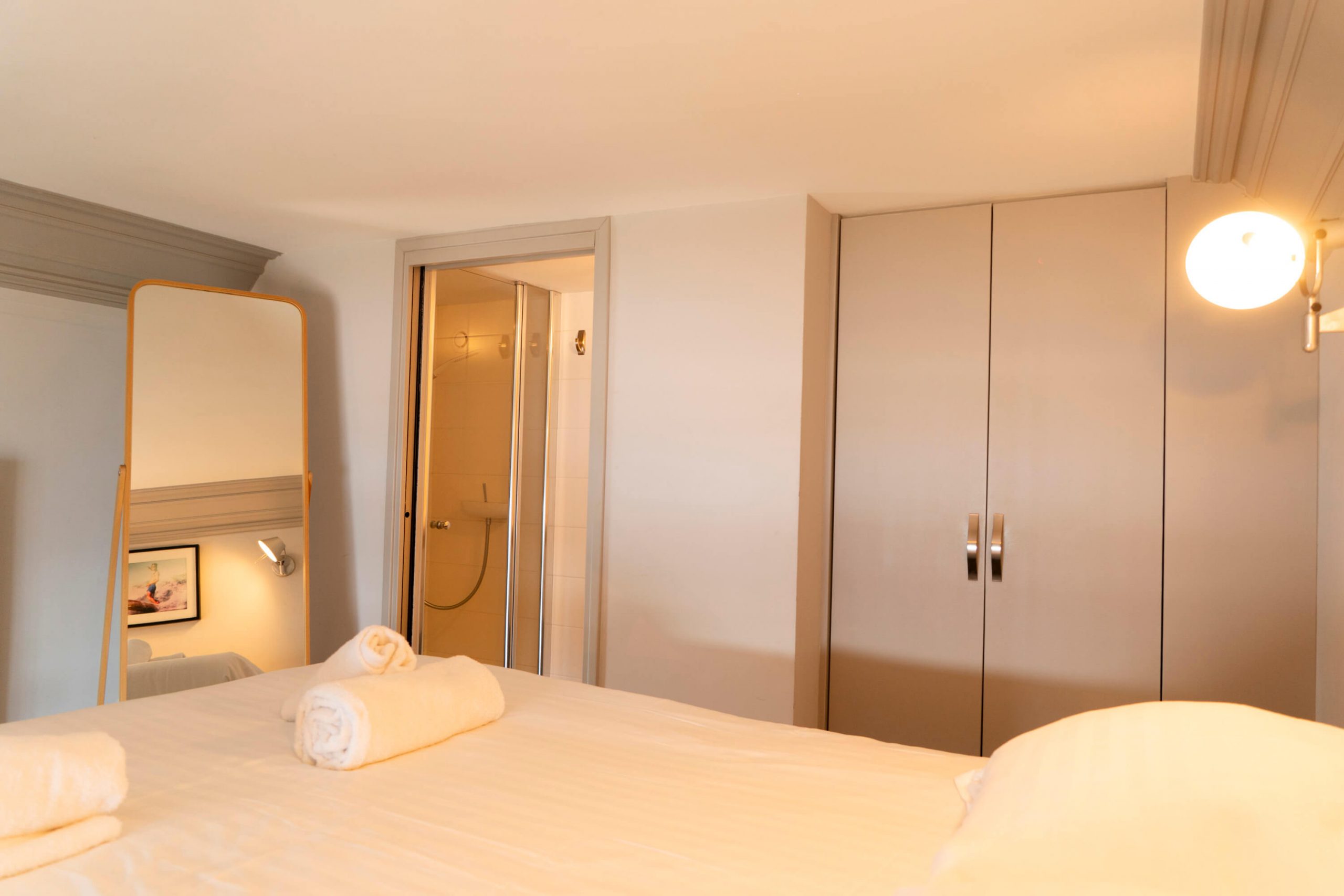 Une chambre avec lit king size, salle d’eau attenante et placard intégré.