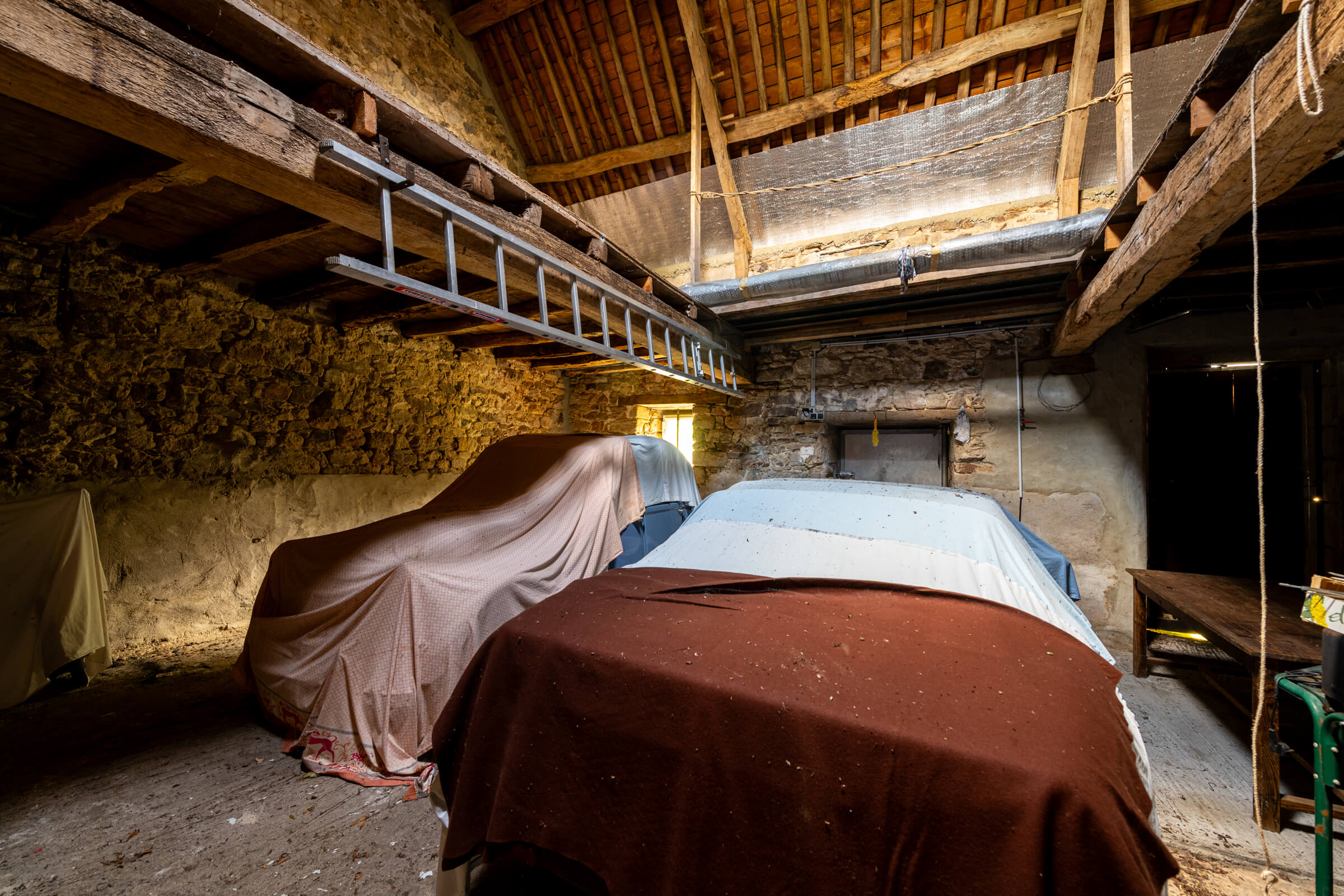 Les bâtiments annexes, grange, dépendances en pierre, double garage de 110 m² avec grenier, ouvrent un champ de possibilités rare, bien au-delà d’une habitation classique.